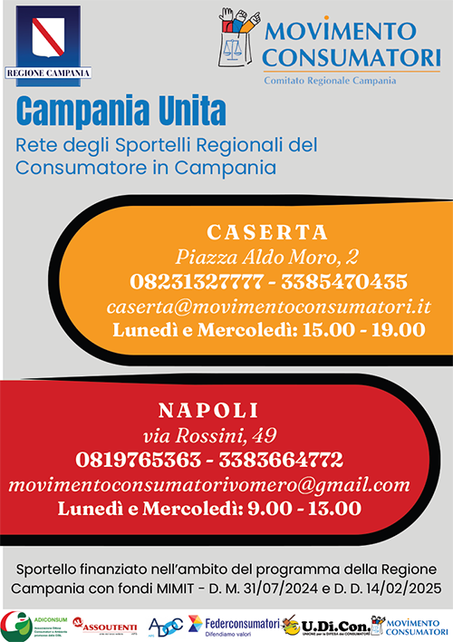 Si rinnova l’impegno del Movimento Consumatori Campania attraverso le proprie sedi territoriali di Napoli e Caserta nell’ambito del progetto “Rete degli Sportelli Regionali del Consumatore in Campania – ATS Campania Unita” afferente il programma generale di intervento della Regione Campania grazie ai fondi del Ministero delle Imprese e del made in Italy - D. M. 31/07/2024 e D. D. 14/02/2025.